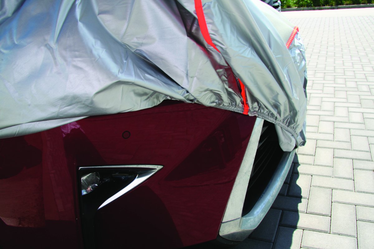 Plachta se snadno nasazuje a díky třem všitým popruhům a elastickým okrajům pevně drží na místě. Reflexní značky vpředu, vzadu i po stranách zajišťují lepší viditelnost a bezpečnost zaparkovaného vozidla.