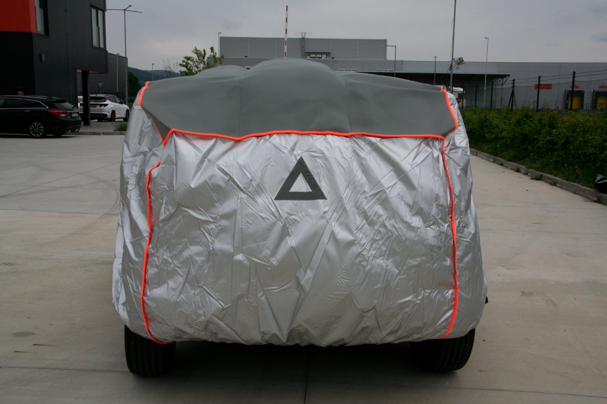 Plachta se snadno nasazuje a díky třem všitým popruhům a elastickým okrajům pevně drží na místě. Reflexní značky vpředu, vzadu i po stranách zajišťují lepší viditelnost a bezpečnost zaparkovaného vozidla.