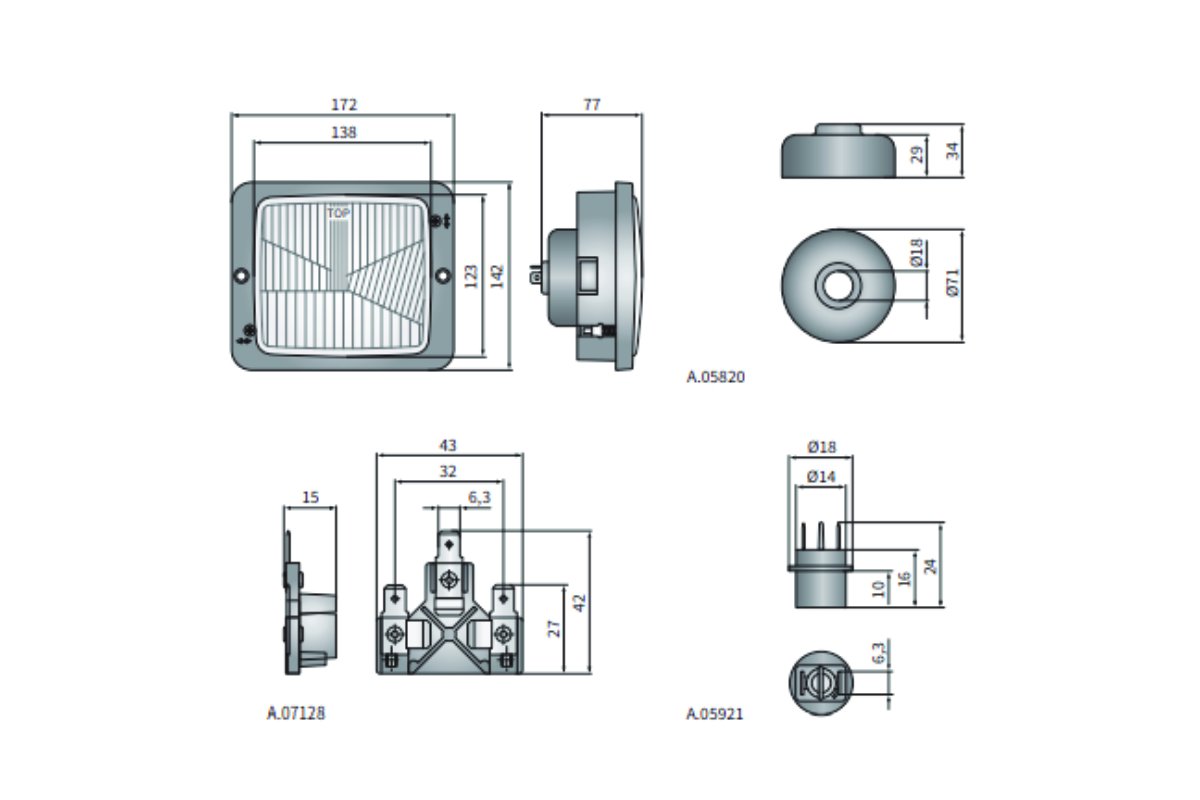 Parabola je vybavena odolnou konstrukcí s krytím IP54, která chrání světlo před prachem a stříkající vodou. Napájení 12–24 V DC umožňuje její univerzální použití u osobních, užitkových i pracovních vozidel. Díky kompaktním rozměrům 172 × 142 × 77 mm je vhodná pro montáž do standardních světlometových systémů.